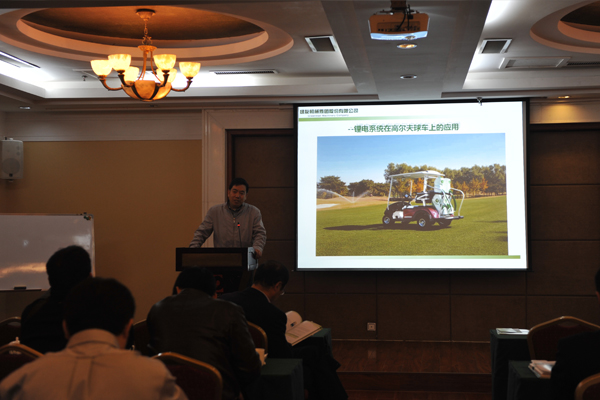 會(huì)議第二項(xiàng)內(nèi)容由綠友集團(tuán)OHEV事業(yè)部張得玉先生匯報(bào)鋰電系統(tǒng)在高爾夫球場(chǎng)上的應(yīng)用。這是個(gè)全新的課題,大家聽得非常認(rèn)真。在高爾夫業(yè)內(nèi)現(xiàn)階段使用的都是鉛酸電池,張得玉先生從鉛酸電池對(duì)環(huán)境的污染和鉛酸廢舊電池如何處理,以及鉛酸電池性能與鋰電電池性能的巨大差距等幾個(gè)方面匯報(bào)了行業(yè)內(nèi)目前的狀況。由于鉛酸電池本身性能上有缺陷,使用壽命短,業(yè)內(nèi)以后的發(fā)展趨勢(shì)一定會(huì)向著更加環(huán)保、安全和性能卓越方面發(fā)展,綠友集團(tuán)走在了行業(yè)的前面。