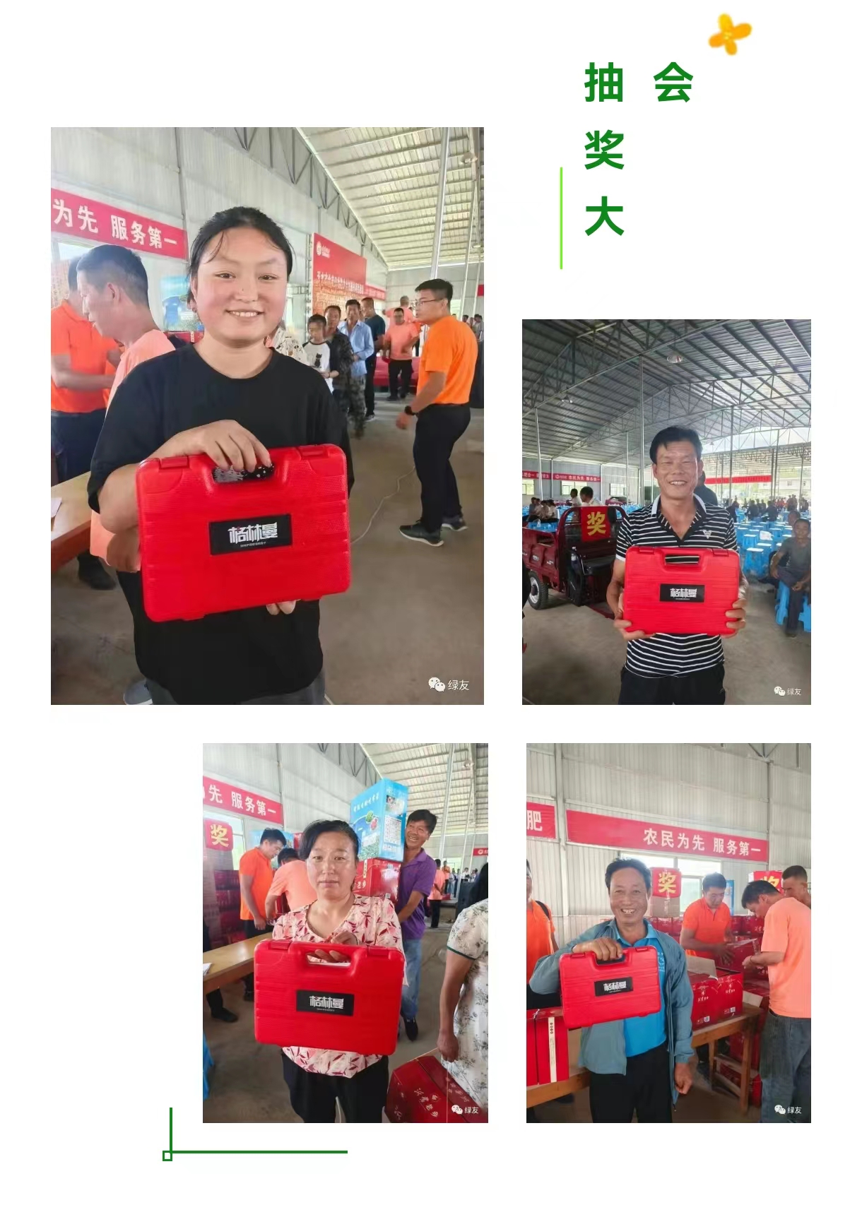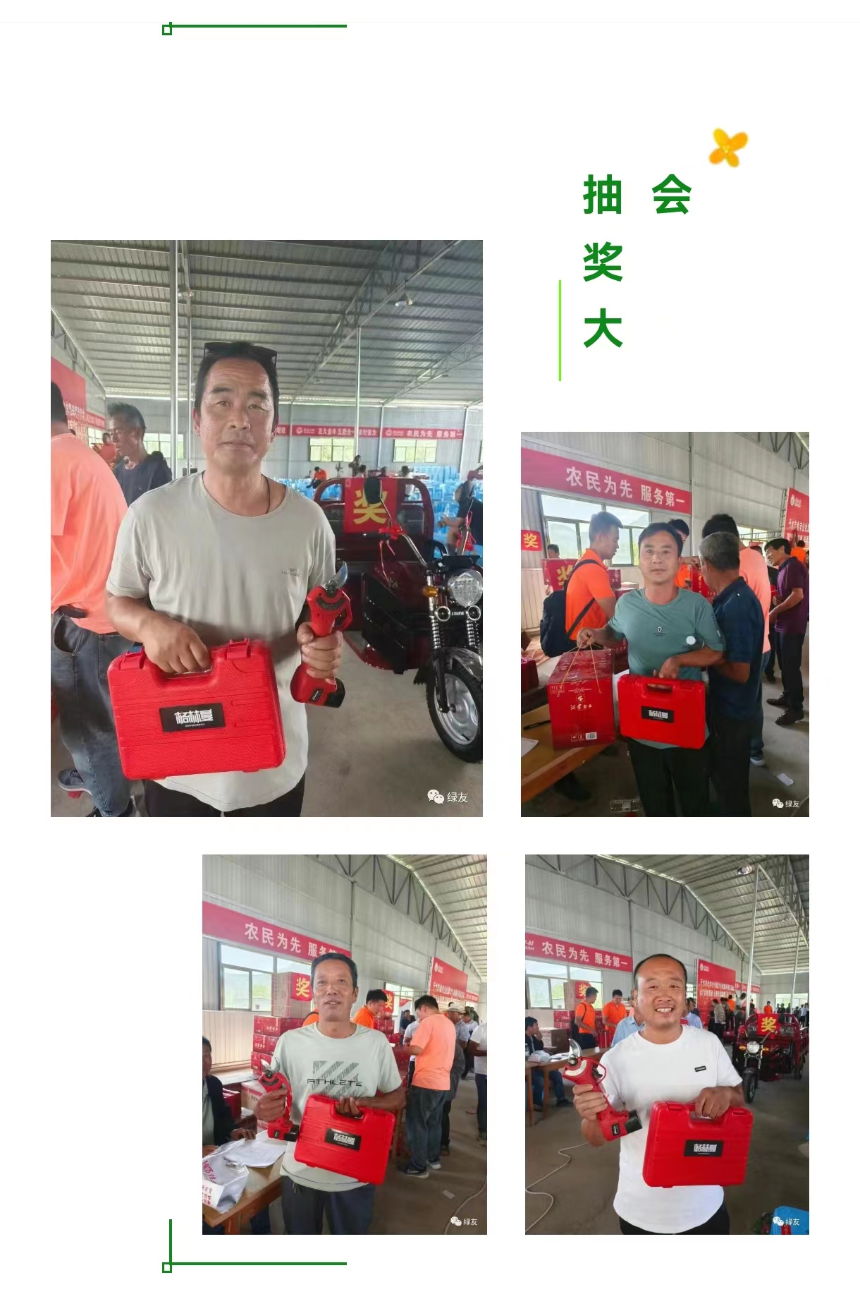 西安綠友園林機(jī)械有限公司寶雞分公司攜手某公社分別于824日和93日舉辦助力鄉(xiāng)村振興項(xiàng)目千人抽獎(jiǎng)大會(huì)。每場(chǎng)次參會(huì)人員均達(dá)千余人,綠友公司的格林曼電動(dòng)修枝剪作為獎(jiǎng)品,廣受農(nóng)戶好評(píng)。