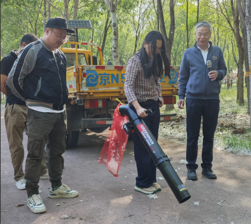 2025年4月29日,北京市園林綠化局在通州區舉行楊柳飛絮防治現場會。會上,北京市園林綠化局二級巡視員王小平介紹了北京市楊柳飛絮防治方案及取得的階段性成果,特別是對綠友集團依托北京市科委項目完成的兩款防治產品-電動樹干打孔注藥機ZYJ15D和輕便型楊柳飛絮吸絮機SJ300D在飛絮防治中的作用表示高度認可。綠友集團總裁李敏現場介紹了兩款產品的研發情況、工作原理及產品特點,并由工作人員現場進行了實際操作演示,得到了參會領導、同行及使用單位的一致認可?,F場會同時進行了首批輕便型楊柳飛絮吸絮機SJ300D的集中發放儀式,來自包括中央黨校園林處、北海公園、頤和園、通州區園林綠化局、通州區城管委、國家植物園、北京安貞醫院、經開區生態環境管理局、西城環衛等在內的近20家單位現場領取了綠友集團研發生產的SJ300D型輕便型楊柳飛絮吸絮機,期待綠友吸絮機能夠在楊柳飛絮防治工作中起到重要作用。