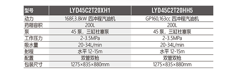 高密度聚乙烯防腐蝕藥箱,藥箱上配有刻度藥量顯示,及時掌握藥液噴灑情況;靈活可轉動的前扶手設計,轉向靈活;單叉雙前輪設計,前輪直徑255mm;雙管雙槍:高壓槍,霧化槍各1套, 高壓水管:D8×30m ,D13×20m